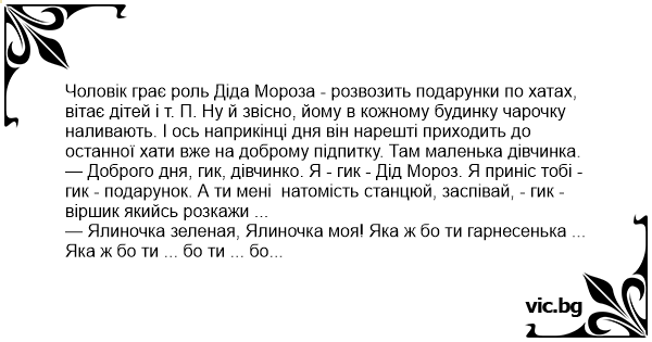 Чоловік грає роль Діда Мороза - розвозить подарунки по хатах, вітає дітей і т. П. Ну й звісно, йому в кожному будинку чарочку наливають. І ось наприкінці дня він нарешті приходить до останної хати вже на доброму підпитку. Там маленька дівчинка.