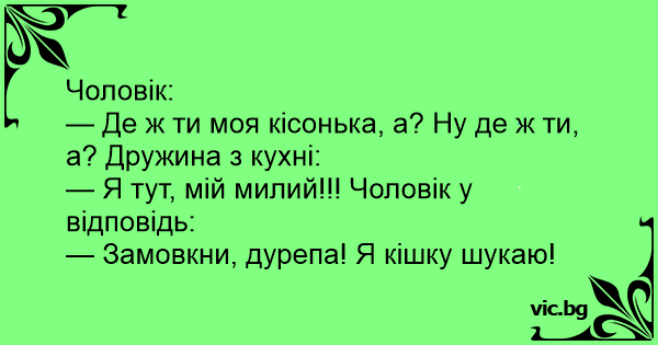 — Де ж ти моя кісонька, а? Ну де ж ти, а? Дружина з кухні:
