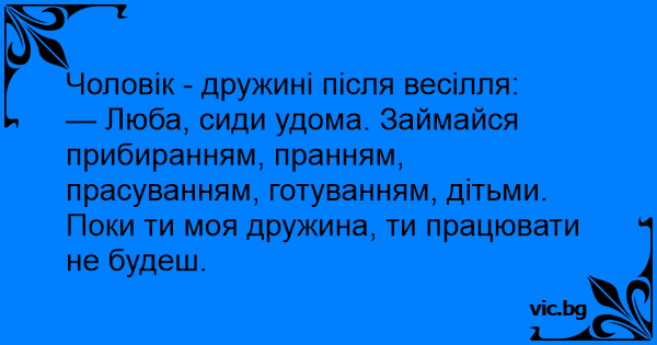 — Люба, сиди удома. Займайся прибиранням, пранням, прасуванням, готуванням, дітьми. Поки ти моя дружина, ти працювати не будеш.