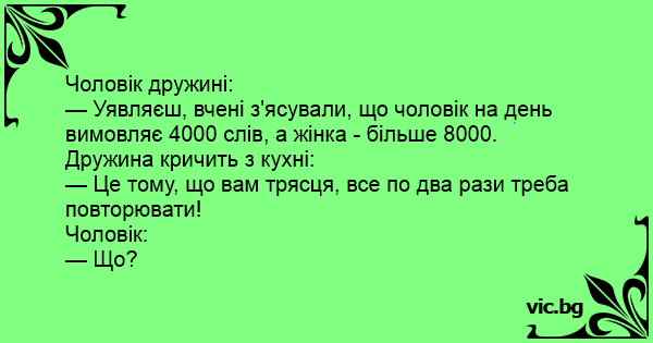 — Уявляєш, вчені з'ясували, що чоловік на день вимовляє 4000 слів, а жінка - більше 8000.