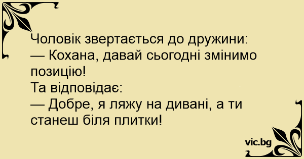 — Добре, я ляжу на дивані, а ти станеш біля плитки!