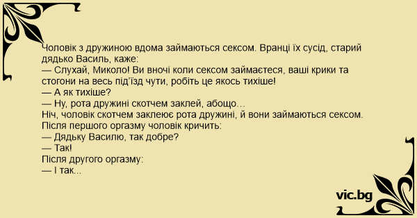 Чоловік з дружиною вдома займаються сексом. Вранці їх сусід, старий дядько Василь, каже: