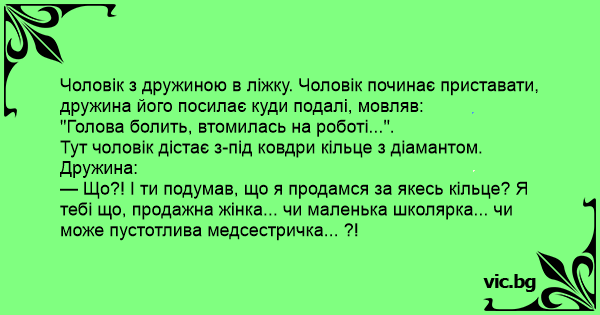 Чоловік з дружиною в ліжку. Чоловік починає приставати, дружина його посилає куди подалі, мовляв: