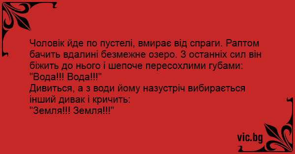 Чоловік йде по пустелі, вмирає від спраги. Раптом бачить вдалині безмежне озеро. З останніх сил він біжить до нього і шепоче пересохлими губами: