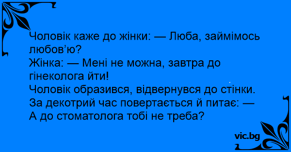 На забар Squeaky Clean Doctor's Appointment Tomorrow Chiste del ginecólogo y el dentista Zahnarzt-Termin Ραντεβού στον γυναικολόγο Ραντεβού με τον οδοντίατρο Една вечер след като семейна двойка си легнали, мъжът нежно потупал съпругата си по рамото. Тя: Ночь. Мужу не спится, хочется, и он теребит жену. Она отвечает: One night, a couple is in the bed and the husband smoothly caresses their wife's arm... the wife is turned and she tells him: Un couple vient de se coucher. L'homme dit à sa femme : - Скъпи, гинекологът ми каза, две седмици никакъв секс! Ένα βράδυ ένα ζευγάρι έχει πέσει για ύπνο. Ο άνδρας αρχίζει να χαϊδεύει τη γυναίκα του απαλά. Αυτή γυρίζει και του λέει : A lady tells her husband, “My gynecologist said I can’t have sex for two weeks.” He replies, “What did your dentist say?” Un soir, alors qu’un couple se couche, le mari commence à caresser le bras de sa femme. Elle se retourne et lui dis: "Je suis désolé chéri, j’ai un rendez-vous chez le gynécologue demain et je veux rester ‘fraîche’." Le mari déçu se retourne. Quelques minutes plus tard, il se tourne de nouveau... Una pareja se acuesta en la cama, y el marido empieza a tocar a su esposa. La mujer se resiste y dice: - Lo siento amor, pero mañana temprano tengo cita con el ginecólogo y quiero estar fresca. Entonces el esposo le contesta: - Ok, pero con el dentista no tienes cita? C'est un couple qui vient de se coucher. Le type a vraiment envie de faire l'amour. Mais sa compagne réplique qu'elle a un rendez-vous chez le gynécologue et elle veut rester fraîche. Un peu plus... Mitt i natten vaknar mannen, kryper ner till hustrun och gör några försiktiga närmanden. - Nej, det går inte, säger frun bestämt. Imorgon ska jag till gynekologen. Mannen tänker efter, kryper... Eheleute liegen im Bett und er hat Lust auf Sex. Seine Frau lehnt ab, weil sie am nächsten Tag einen Gynäkologentermin hat und deshalb möchte sie jetzt nicht. Er dreht sich zur Seite und versucht... Mann og kone ligger i senga en kveld når mannen prikker kona på skulderen og beginner å klappe armen hennes. Kona snur seg og sier «Beklager kjære. Jeg skal til gynekologen i morgen og vil være ren... Ein Ehepaar ist zu Bett gegangen und nach einer Weile deutet er an, dass er Sex haben will. Sie lehnt ab: "Ich habe morgen einen Termin beim Gynäkologen und deshalb mag ich jetzt nicht." Er dreht... Emiel ligt al de halve nacht te woelen. Op een gegeven moment maakt hij zijn vrouw wakker en zegt: "Schatje, ik heb zo'n zin om met je te vrijen?" Zijn vrouw zegt: "Uhhh .... nee liefje, dat kan... Wife comes back from the doctor and says to her husband: Honey, I have a sad news - a gynecologist told me not have sex for a three weeks... Husband: And what the dentist said? Na cama, o sujeito começa a acariciar a mulher, mas ela o repele: — Sinto muito, querido, mas amanhã eu tenho uma consulta no ginecologista e... — Já entendi — diz o marido, contrariado. E depois... „Schatz, mein Frauenarzt sagt wir können erstmal keinen Sex haben.“ …„und was sagt dein Zahnarzt?“ Para nowożeńców leży w łóżku wieczorem, kiedy facet nabrał ochoty na seks, pochyla się w stronę żony i puka ją lekko w ramię. Ona odwraca się do niego i mówi: - Nie możemy się dzisiaj kochać, rano... Na, Schatz, wie wär’s… wollen wir heute Abend mal wieder…? - Bitte heute nicht, Du weißt doch, dass ich morgen einen Termin beim Frauenarzt habe! - Na ja, aber Du hast doch nicht auch noch einen... Un uomo si sveglia eccitatissimo nel mezzo della notte. Sveglia la moglie e le propone una sveltina. Ma la moglie risponde: - 'Domani ho un appuntamento con il ginecologo. Sai che non voglio farlo... Eräänä iltana pariskunta makaa sängyllä ja aviomies taputtaa vaimoa olkapäälle ja alkaa hieromaan vaimon käsivartta. Vaimo kääntyy ja sanoo: - Sori kulta, tapaan huomenna gynekologin ja haluan... Det är natt, och mannen kryper närmare hustrun. - Det går inte, jag ska till gynekologen imorgon, säger frun. Han drar tillbaka handen. Men efter en liten stund frågar mannen hoppfullt. - Men du... Killen låg i sängen och trevade efter tjejen, i hopp om att få något. - Nej, inte ikväll sa tjejen. Jag ska till gynekologen imorgon bitti och vill vara någorlunda fräsch. Sedan blev det tyst,... Barbatul:Nevasta, nu ai chef de sex? Nevasta:Nu pot ca maine merg la ginecolog, B: (dupa 5 minute)Da la dentist te duci?? - Min gynekolog sa att jag inte kan ha sex på två veckor. - Jaha, men din tandläkare har väl inte avrådit från sex…