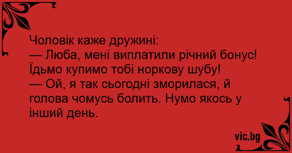 — Люба, мені виплатили річний бонус! Їдьмо купимо тобі норкову шубу!