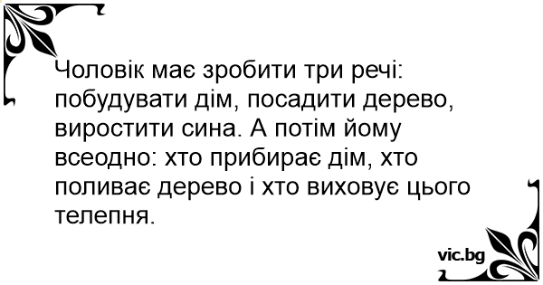 Чоловік має зробити три речі: побудувати дім, посадити дерево, виростити сина. А потім йому всеодно: хто прибирає дім, хто поливає дерево і хто виховує цього телепня.