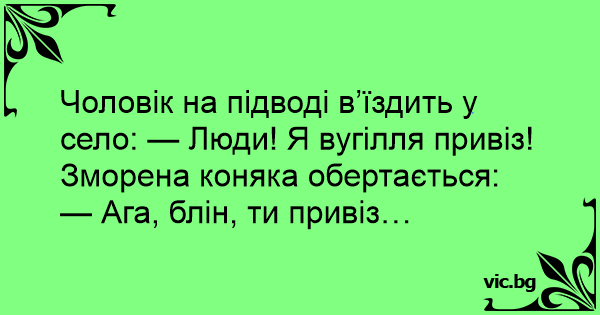 Дядько на возі в'їжджає до села: — Люди !!! Я вугілля привіз !!! Втомлений кінь обертається: — А то ж, курво, ТИ привіз ...