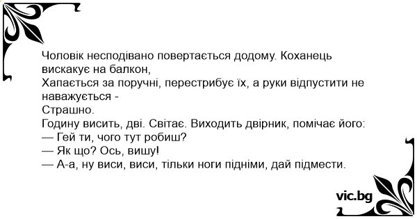 Чоловік несподівано повертається додому. Коханець вискакує на балкон,