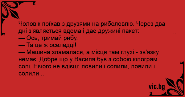 — Машина зламалася, а місця там глухі - зв'язку немає. Добре що у Василя був з собою кілограм солі. Нічого не вдієш: ловили і солили, ловили і солили ...