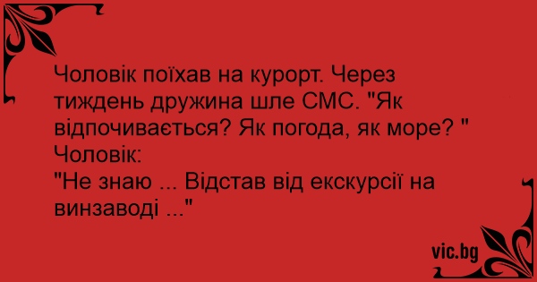 Чоловік поїхав на курорт. Через тиждень дружина шле СМС. "Як відпочивається? Як погода, як море? "