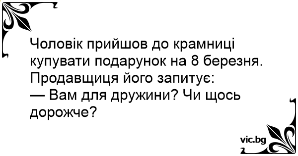 Чоловік прийшов до крамниці купувати подарунок на 8 березня. Продавщиця його запитує: