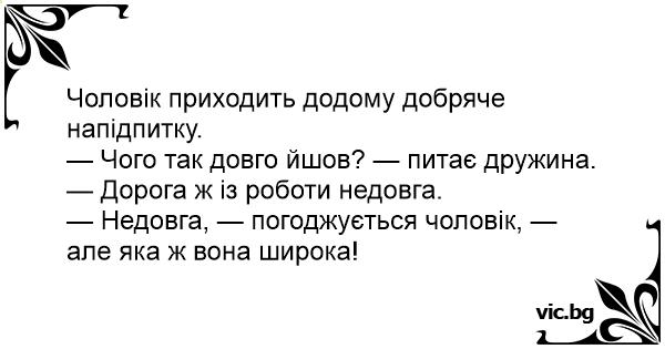 — Чого так довго йшов? — питає дружина. — Дорога ж із роботи недовга.