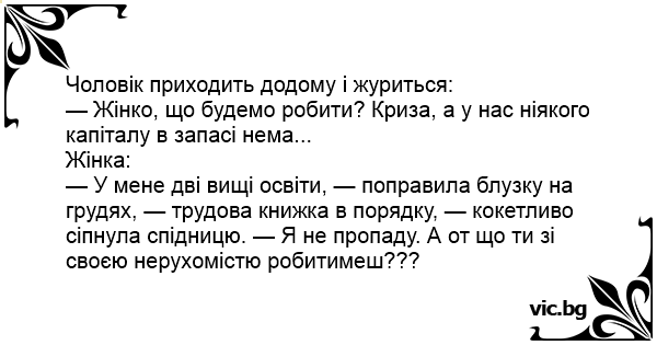 — Жінко, що будемо робити? Криза, а у нас ніякого капіталу в запасі нема...
