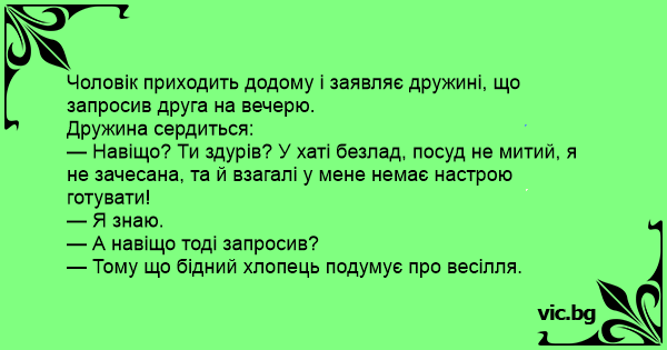 Чоловік приходить додому і заявляє дружині, що запросив друга на вечерю.