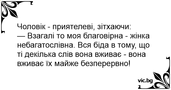 — Взагалі то моя благовірна - жінка небагатослівна. Вся біда в тому, що ті декілька слів вона вживає - вона вживає їх майже безперервно!