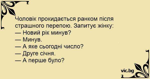Чоловік прокидається ранком після страшного перепою. Запитує жінку: