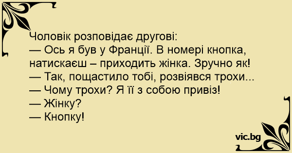 — Ось я був у Франції. В номері кнопка, натискаєш – приходить жінка. Зручно як!