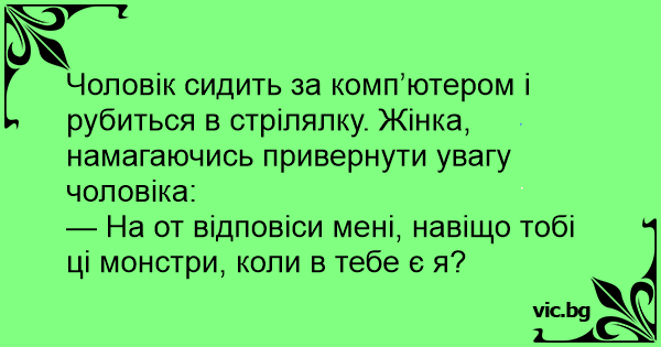 Чоловік сидить за комп’ютером і рубиться в стрілялку. Жінка, намагаючись привернути увагу чоловіка: