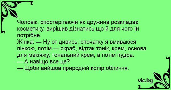 Жінка: — Ну от дивись: спочатку я вмиваюся пінкою, потім — скраб, відтак тонік, крем, основа для макіяжу, тональний крем, а потім пудра.
