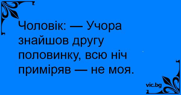 Чоловік: — Учора знайшов другу половинку, всю ніч приміряв — не моя.