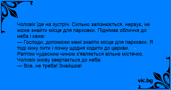 Чоловік їде на зустріч. Сильно запізнюється, нервує, не може знайти місце для парковки. Піднімає обличчя до неба і каже: