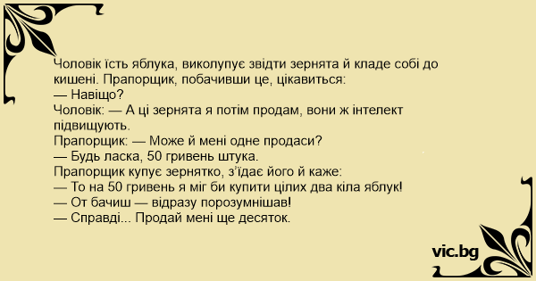Чоловік їсть яблука, виколупує звідти зернята й кладе собі до кишені. Прапорщик, побачивши це, цікавиться: