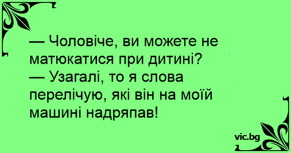 — Узагалі, то я слова перелічую, які він на моїй машині надряпав!