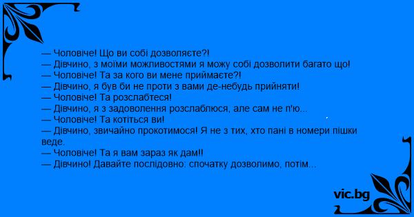 — Дівчино! Давайте послідовно: спочатку дозволимо, потім приймемо, після розслабимося, пізніше прокотимося і тільки потім дасте...