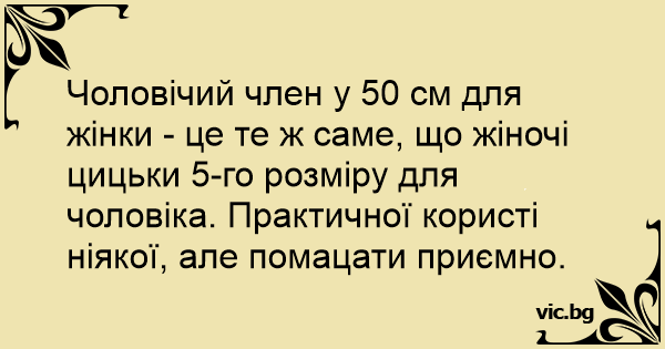 Чоловічий члeн у 50 см для жінки - це те ж саме, що жіночі цицьки 5-го розміру для чоловіка. Практичної користі ніякої, але помацати приємно.