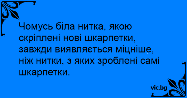 Чомусь біла нитка, якою скріплені нові шкарпетки, завжди виявляється міцніше, ніж нитки, з яких зроблені самі шкарпетки.