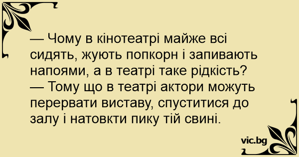 — Чому в кінотеатрі майже всі сидять, жують попкорн і запивають напоями, а в театрі таке рідкість?