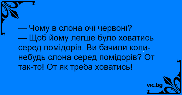 — Щоб йому легше було ховатись серед помідорів. Ви бачили коли-небудь слона серед помідорів? От так-то! От як треба ховатись!
