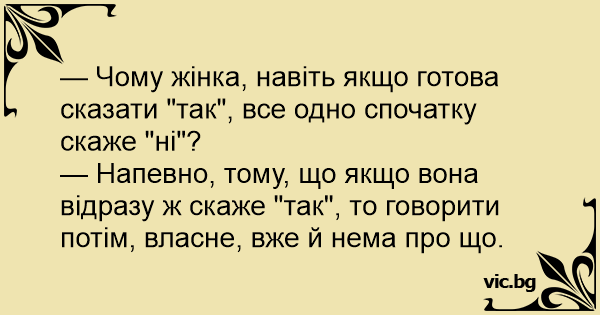 — Чому жінка, навіть якщо готова сказати "так", все одно спочатку скаже "ні"?