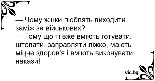 — Тому що ті вже вміють готувати, штопати, заправляти ліжко, мають міцне здоров'я і вміють виконувати накази!