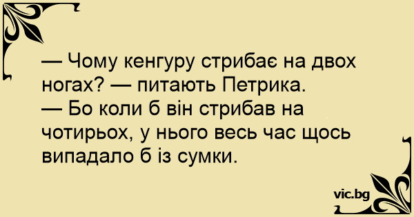 — Чому кенгуру стрибає на двох ногах? — питають Петрика.