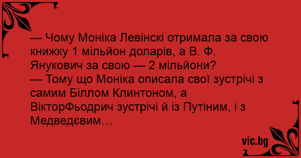 — Чому Моніка Левінскі отримала за свою книжку 1 мільйон доларів, а В. Ф. Янукович за свою — 2 мільйони?