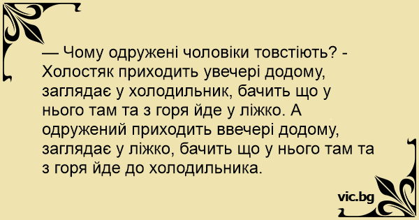 — Чому одружені чоловіки товстіють? - Холостяк приходить увечері додому, заглядає у холодильник, бачить що у нього там та з горя йде у ліжко. А одружений приходить ввечері додому, заглядає у ліжко, бачить що у нього там та з горя йде до холодильника.