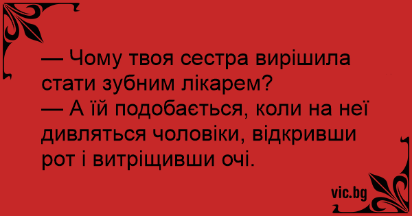 — Чому твоя сестра вирішила стати зубним лікарем?
