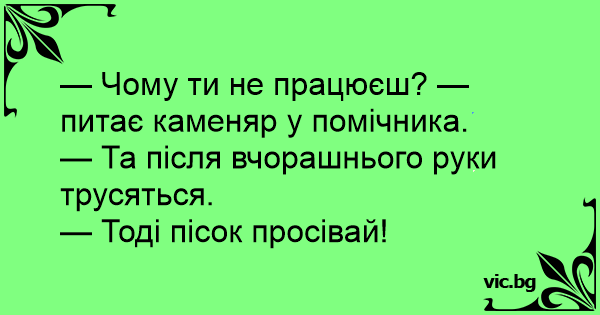 — Чому ти не працюєш? — питає каменяр у помічника.