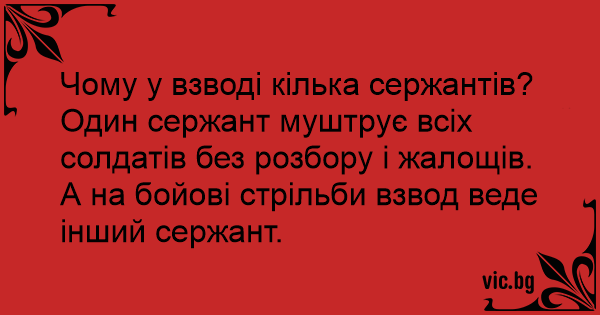 Чому у взводі кілька сержантів? Один сержант муштрує всіх солдатів без розбору і жалощів. А на бойові стрільби взвод веде інший сержант.