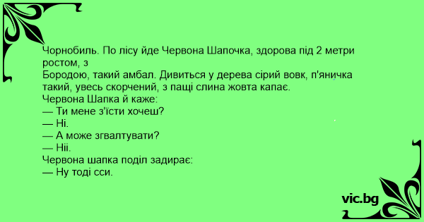 Чорнобиль. По лісу йде Червона Шапочка, здорова під 2 метри ростом, з