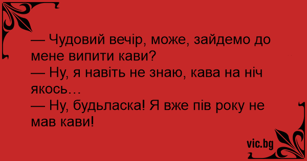 — Чудовий вечір, може, зайдемо до мене випити кави?