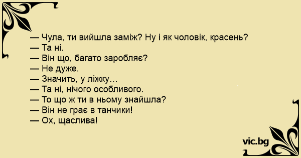 — Чула, ти вийшла заміж? Ну і як чоловік, красень?<br />— Та ні.<br />— Він що, багато заробляє?<br />— Не дуже.<br />— Значить, у ліжку…<br />— Та ні, нічого особливого.<br />— То що ж ти в ньому знайшла?<br />— Він не грає в танчики!<br />— Ох, щаслива!