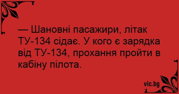 — Шановні пасажири, літак ТУ-134 сідає. У кого є зарядка від ТУ-134, прохання пройти в кабіну пілота.