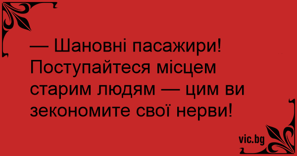 — Шановні пасажири! Поступайтеся місцем старим людям — цим ви зекономите свої нерви!