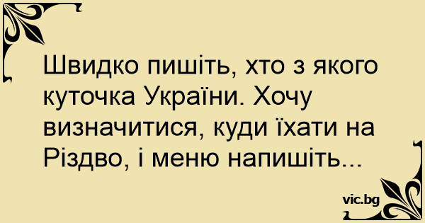 Швидко пишіть, хто з якого куточка України. Хочу визначитися, куди їхати на Різдво, і меню напишіть...