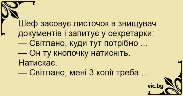 Нов служител стои до шредера (документоунищожителя) в недоумение. Минава покрай него секретарката на офиса: