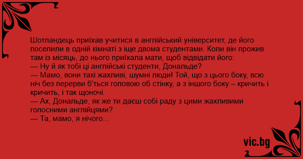 Ένας Σκοτσέζος, πάει να συνεχίσει τις σπουδές του σε ένα πανεπιστήμιο Στο Λονδίνο. Μετά το πρώτο εξάμηνο, δέχεται την επίσκεψη της μητέρας του. - Πως βρίσκεις τους Αγγλους συμφοιτητές σου, παιδί...