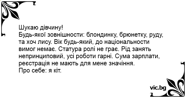 Будь-якої зовнішности: блондинку, брюнетку, руду, та хоч лису. Вік будь-який, до національности вимог немає. Статура ролі не грає. Рід занять непринциповий, усі роботи гарні. Сума зарплати, реєстрація не мають для мене значіння.
